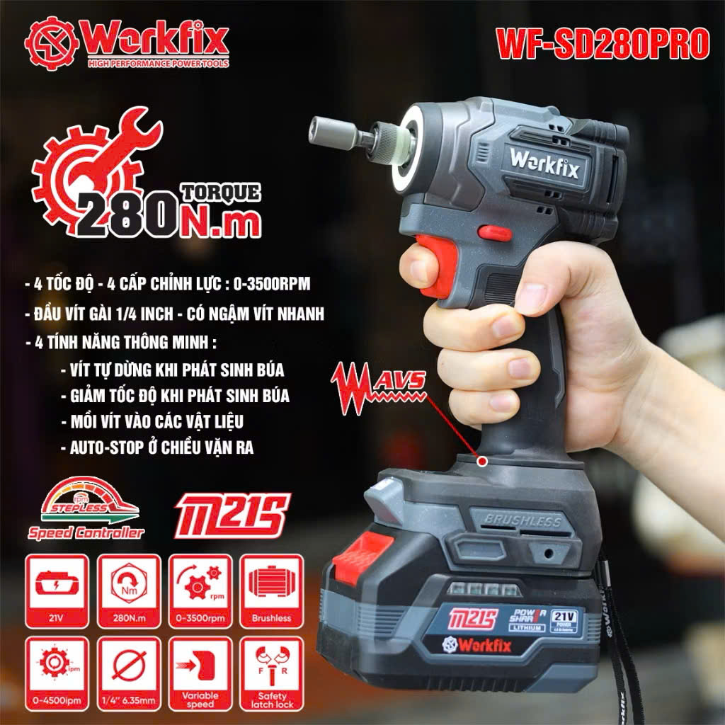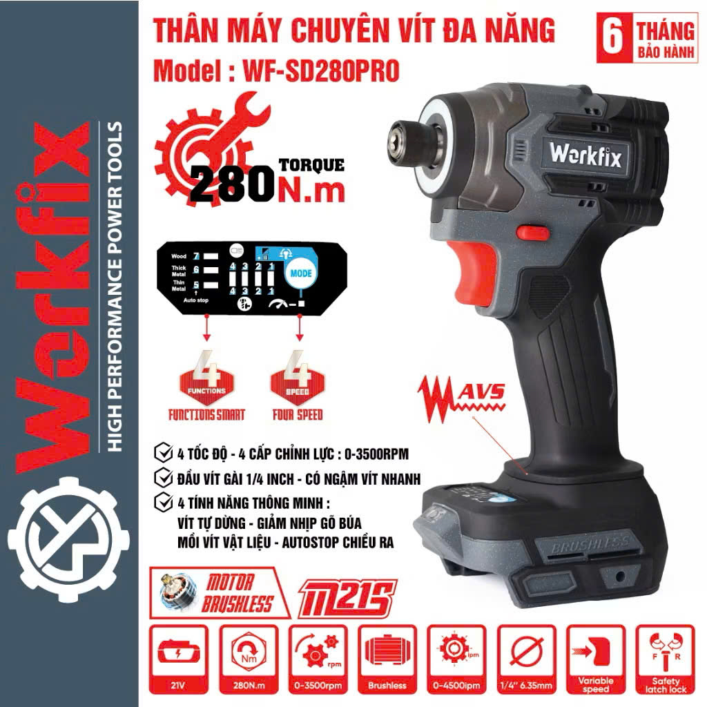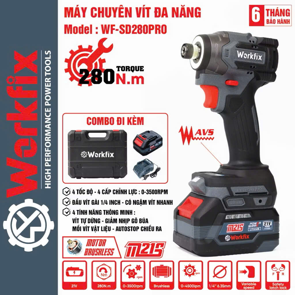 Chuyên vít búa Workfix 280Nm là thiết bị vặn vít chuyên dụng cao cấp, được thiết kế để phục vụ cho công việc nặng, tháo lắp thiết bị cơ khí, xây dựng, nội thất, sửa chữa máy móc, khung sắt, giàn giáo… Máy sử dụng động cơ không chổi than giúp tăng độ bền, hiệu suất cao và hoạt động ổn định hơn các dòng máy dùng chổi than truyền thống.