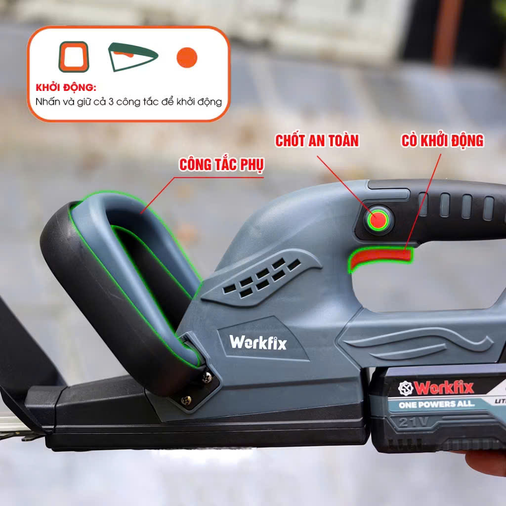 – Tên sản phẩm: Máy cắt tỉa hàng rào WORKFIX WF-HT20, Không chổi than,600W, Chân pin phổ thông 4cm