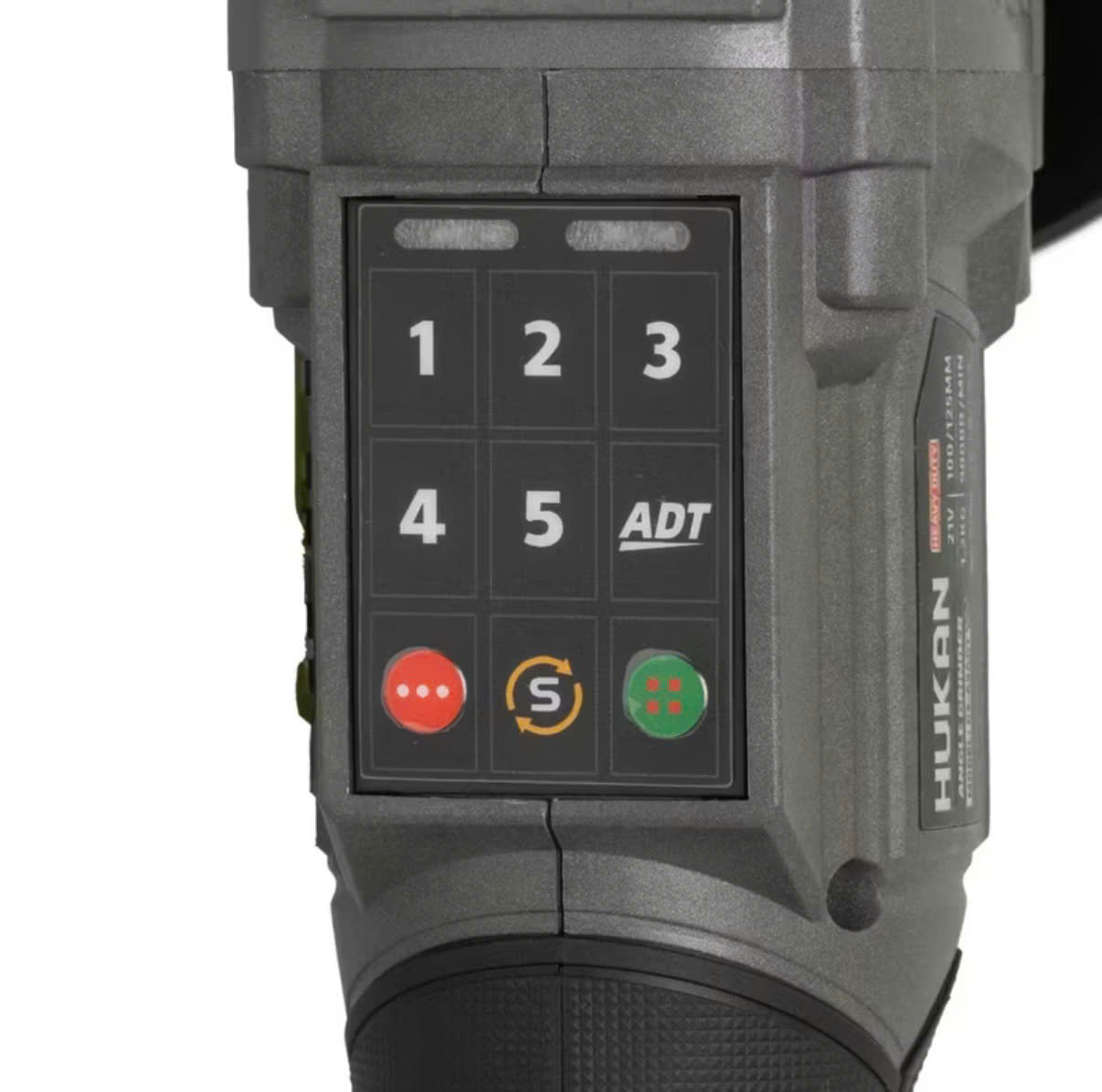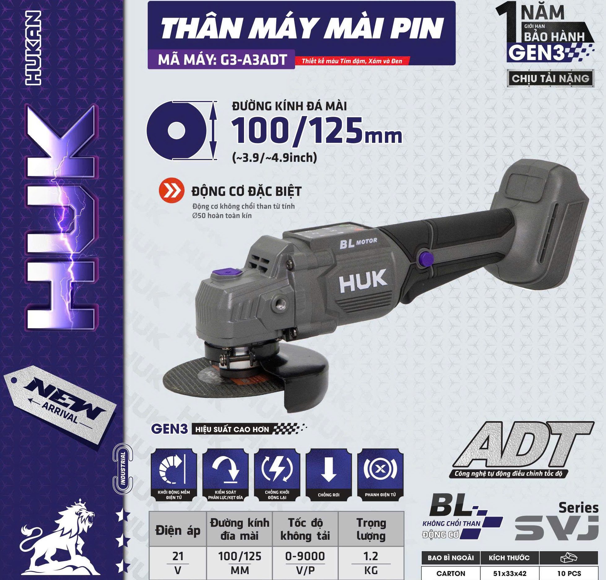 Thân máy mài pin HUKAN G3-A3ADT : thuộc dòng Gen 3, sử dụng pin 21V, có động cơ không chổi than (Brushless) mạnh mẽ, trang bị công nghệ ADT (Automatic Torque Drive) điều chỉnh tốc độ thông minh, 5 cấp tốc độ, dùng đá mài 100/125mm, lý tưởng cho các công việc cắt, mài, đánh bóng di động, là phiên bản nâng cấp của HUKAN với hiệu suất cao và bền bỉ. Thân máy mài pin HUKAN G3-A3ADT là giải pháp mài/cắt di động thế hệ mới dành cho thợ chuyên nghiệp và người dùng bán chuyên. Dùng pin 21V chuẩn M21, kết hợp động cơ Brushless bọc kín (Φ50 mm) giúp hạn chế bụi xâm nhập, tăng tuổi thọ và giữ hiệu suất khi làm việc liên tục. Máy hỗ trợ đá 100mm hoặc 125mm, kèm bảng điều khiển thông minh và công nghệ điều chỉnh tốc độ ADT (Adaptive Dynamic Torque) với 5 mức tốc độ — từ mài tinh tế đến cắt mạnh. Thiết kế gọn, cân bằng, tay cầm công thái học và vỏ tản nhiệt tối ưu giúp thao tác dễ dàng, ít rung, phù hợp cho công trường, xưởng và công việc ngoài trời.